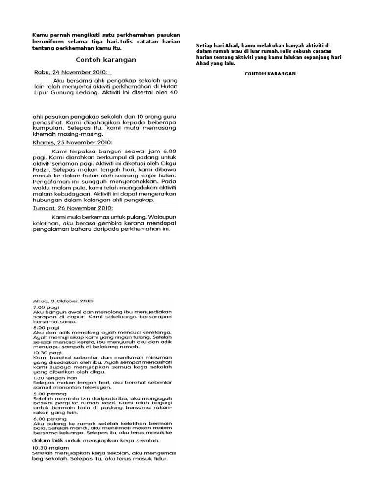 89 menganggap dokumen ini bermanfaat Tandai dokumen ini sebagai bermanfaat. Kamu pernah mengikuti satu perkhemahan pasukan beruniform selama tiga hariTulis catatan harian tentang perkhemahan kamu itu. Jenis harian merujuk kepada aktiviti harian manakala semasa merujuk kepada sambutan sesuatu perayaanmajlis.